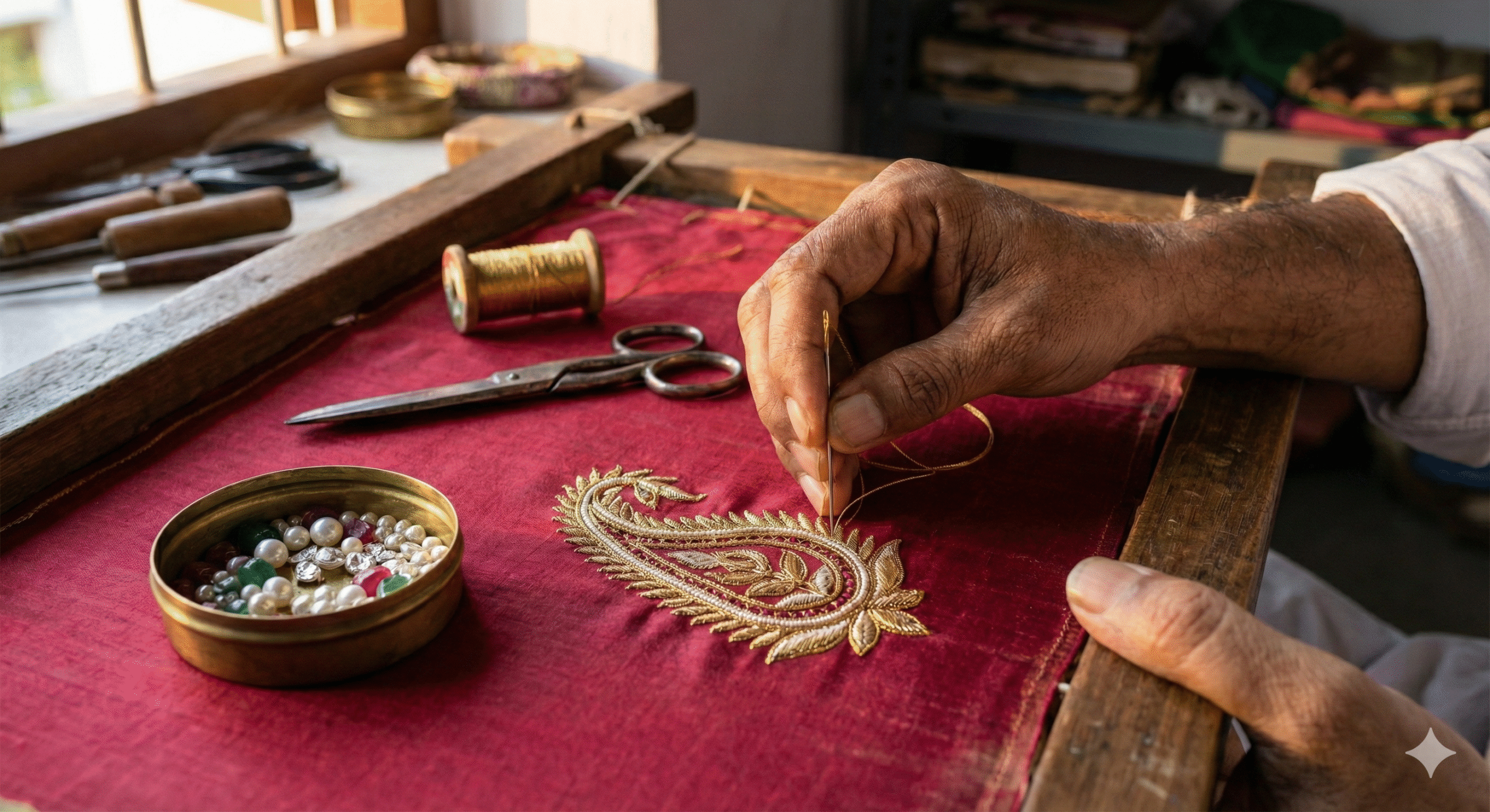 In our workshops, time slows down. Threads warm in the hands of artisans, zari catches the light like tiny blessings, and motifs grow one stitch at a time.